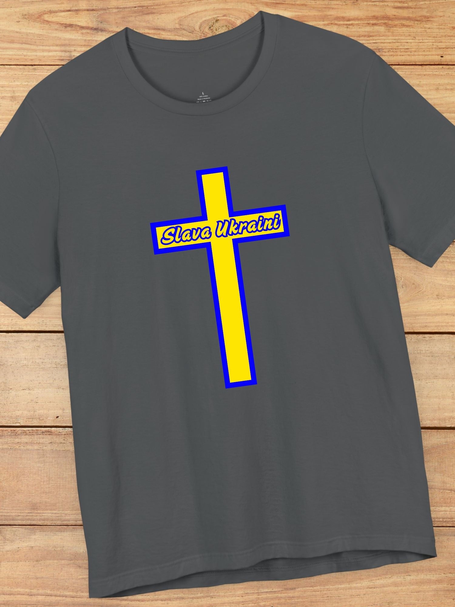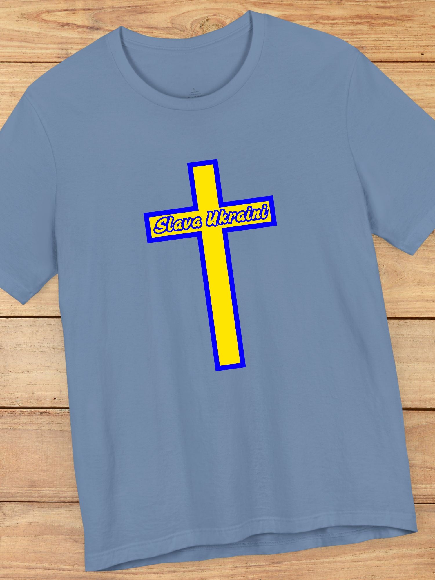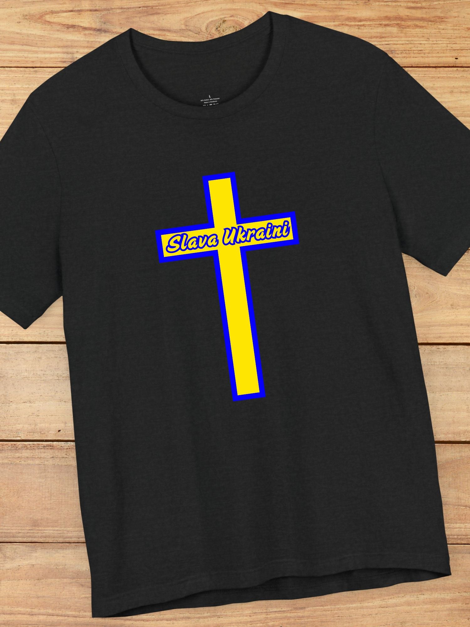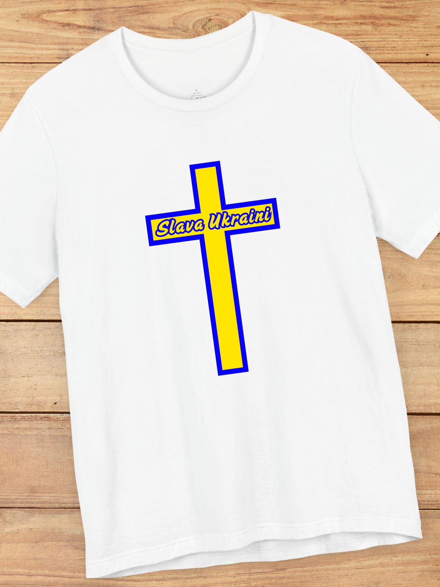 'Slava Ukraini' Inside Blue and Gold Cross Graphic (Front) Unisex T-Shirt. Printed on a quality Bella+Canvas 3001 T-Shirt.