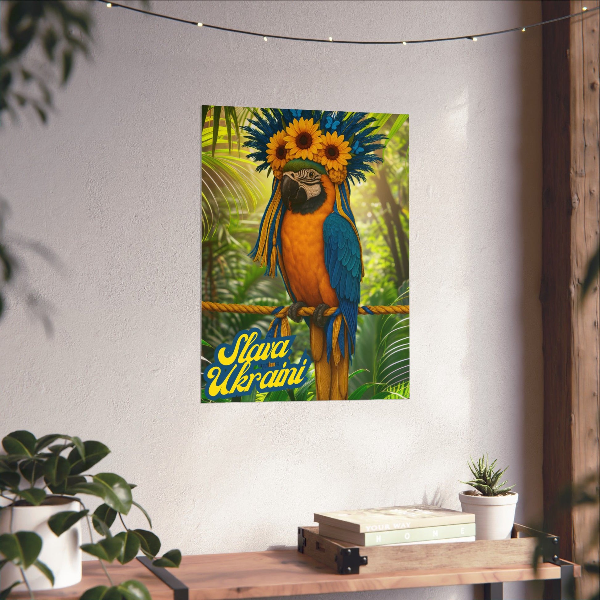 'Slava Ukrani' Blue and Gold McCaw Poster, Ukranian Pride Art, Nature Wall Art, Gift for Bird Lovers, Parrot Lovers, Tropical Home Decor