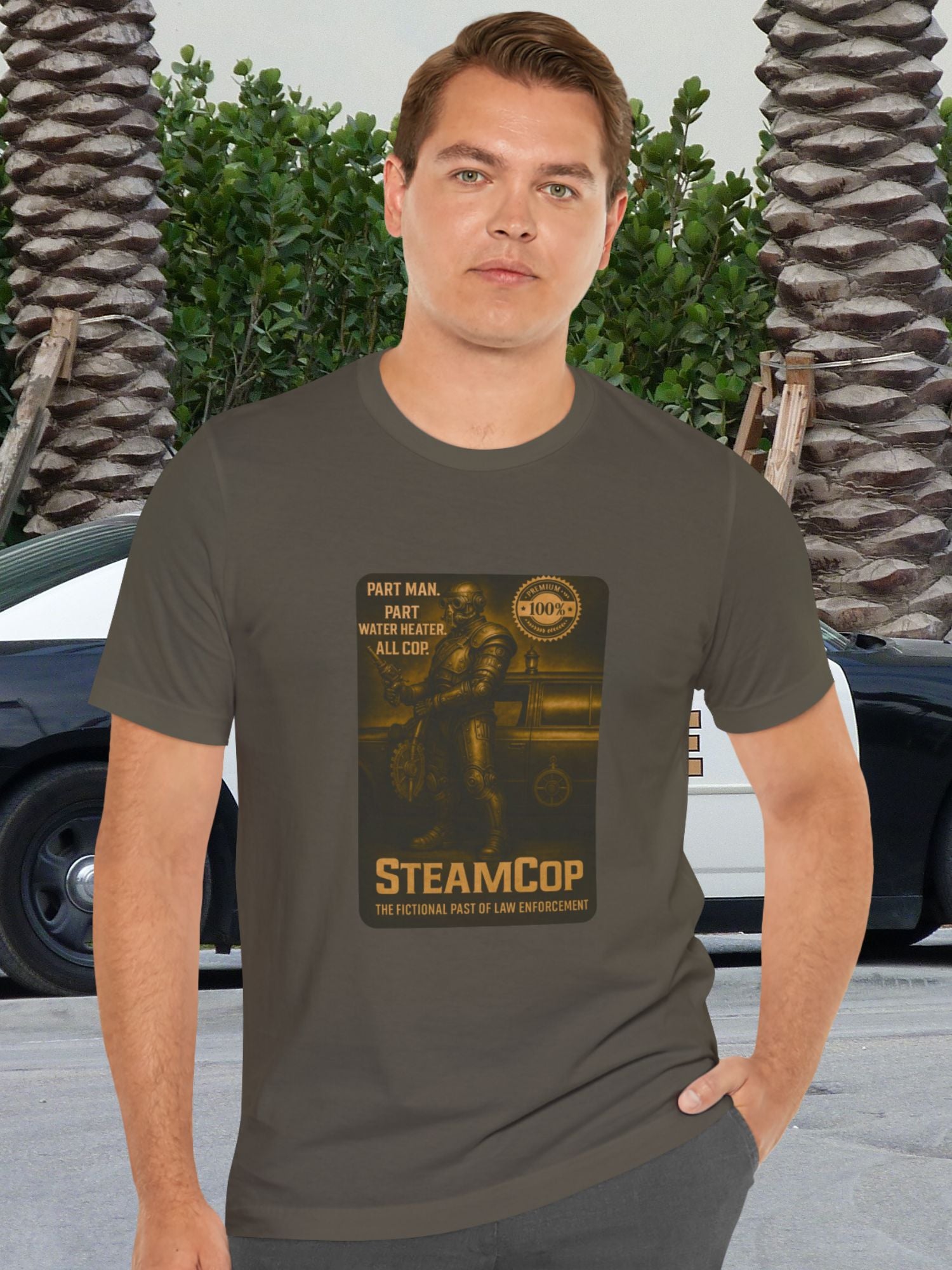 'SteamCop' Graphic Unisex T-Shirt, Retro Sci-Fi Police Themed Tee for Fiction Fans