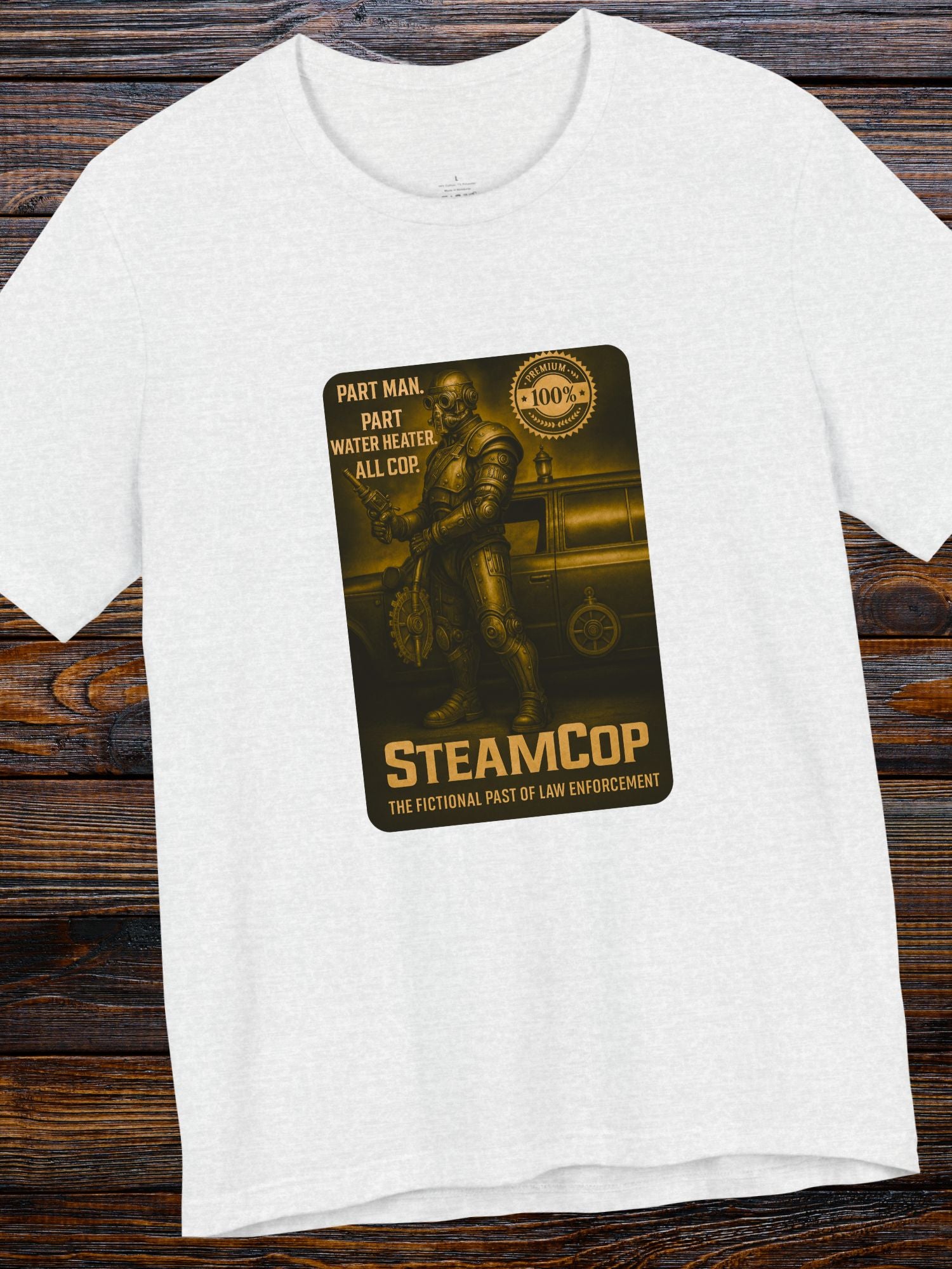 Vintage Steampunk Cyber Cop "SteamCop" Tee Unisex Short Sleeve Tee, for vintage Sci-Fi Fans. Think modern cops have a high pressure job? Forget about it! Steam Cops where under way more pressure! Imagine a mech water heater trying to do paperwork, things were extremely fictitiously hard back then! A good gift for steampunk fans, law enforcement and fans of cyborg cop movies. Printed on a quality Bella+Canvas 3001 T-shirt.