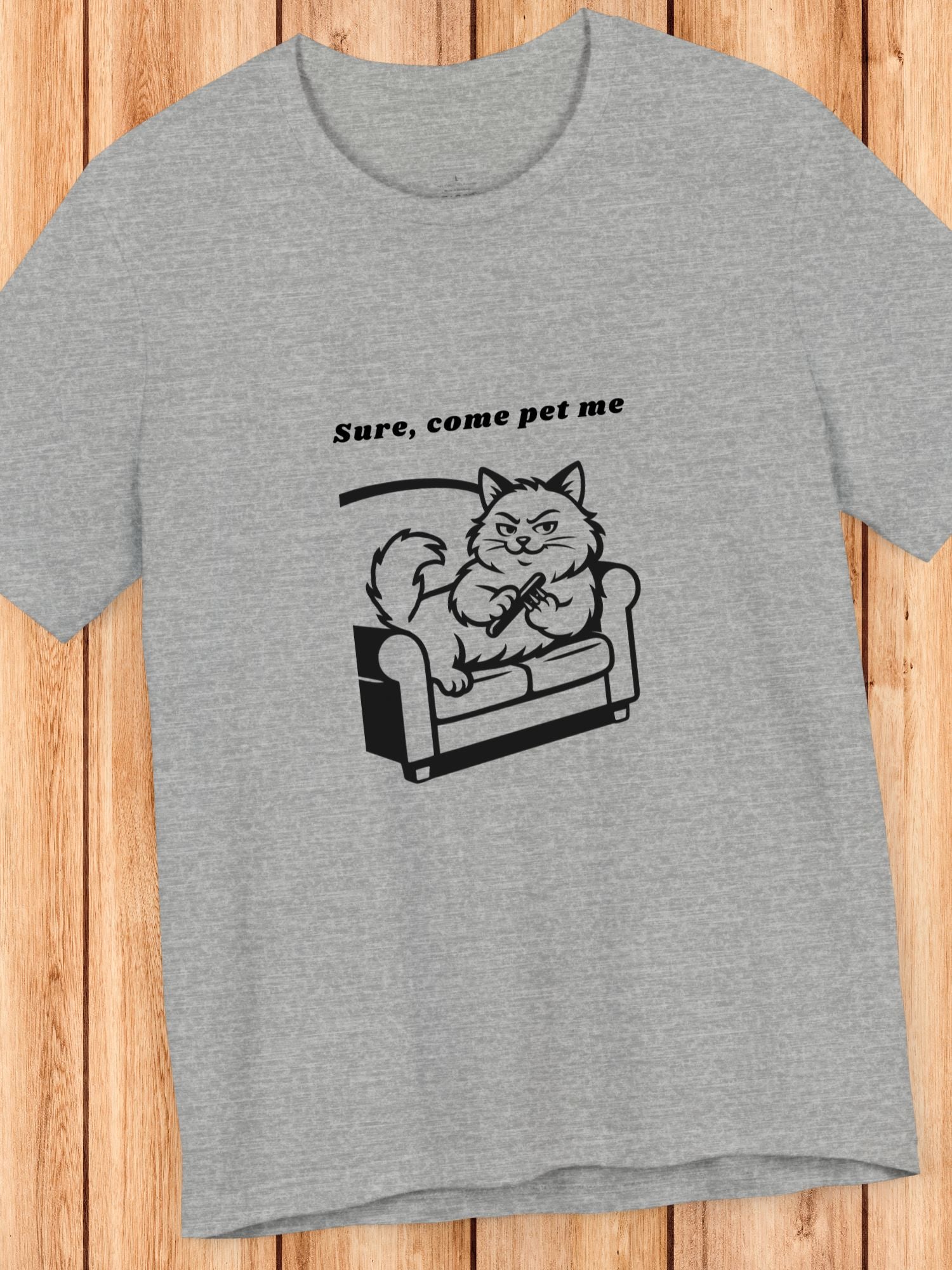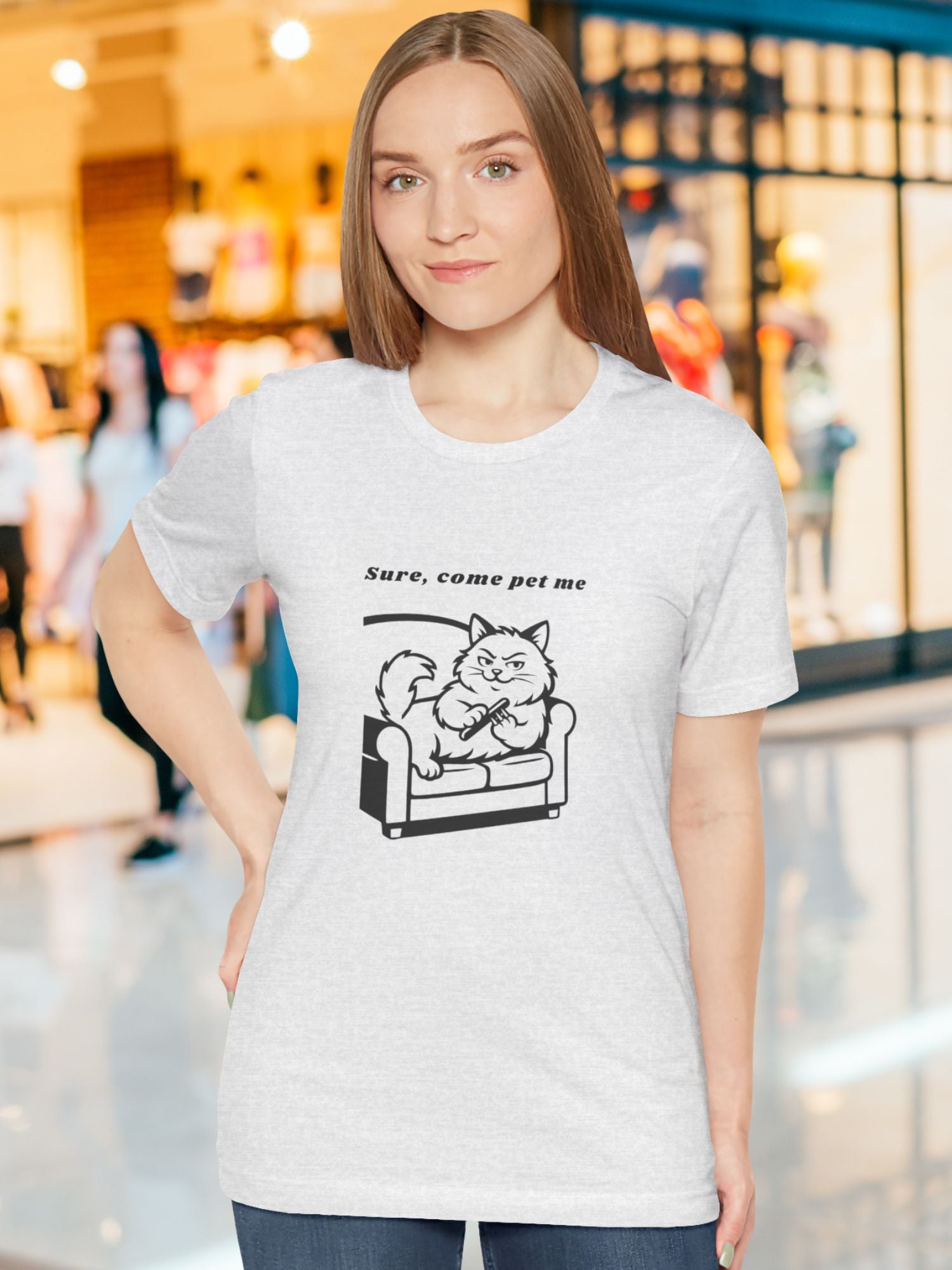'Sure, come pet me' Cat Sharpening Nails Graphic Unisex T-Shirt. Printed on a quality Bella+Canvas 3001 T-Shirt.