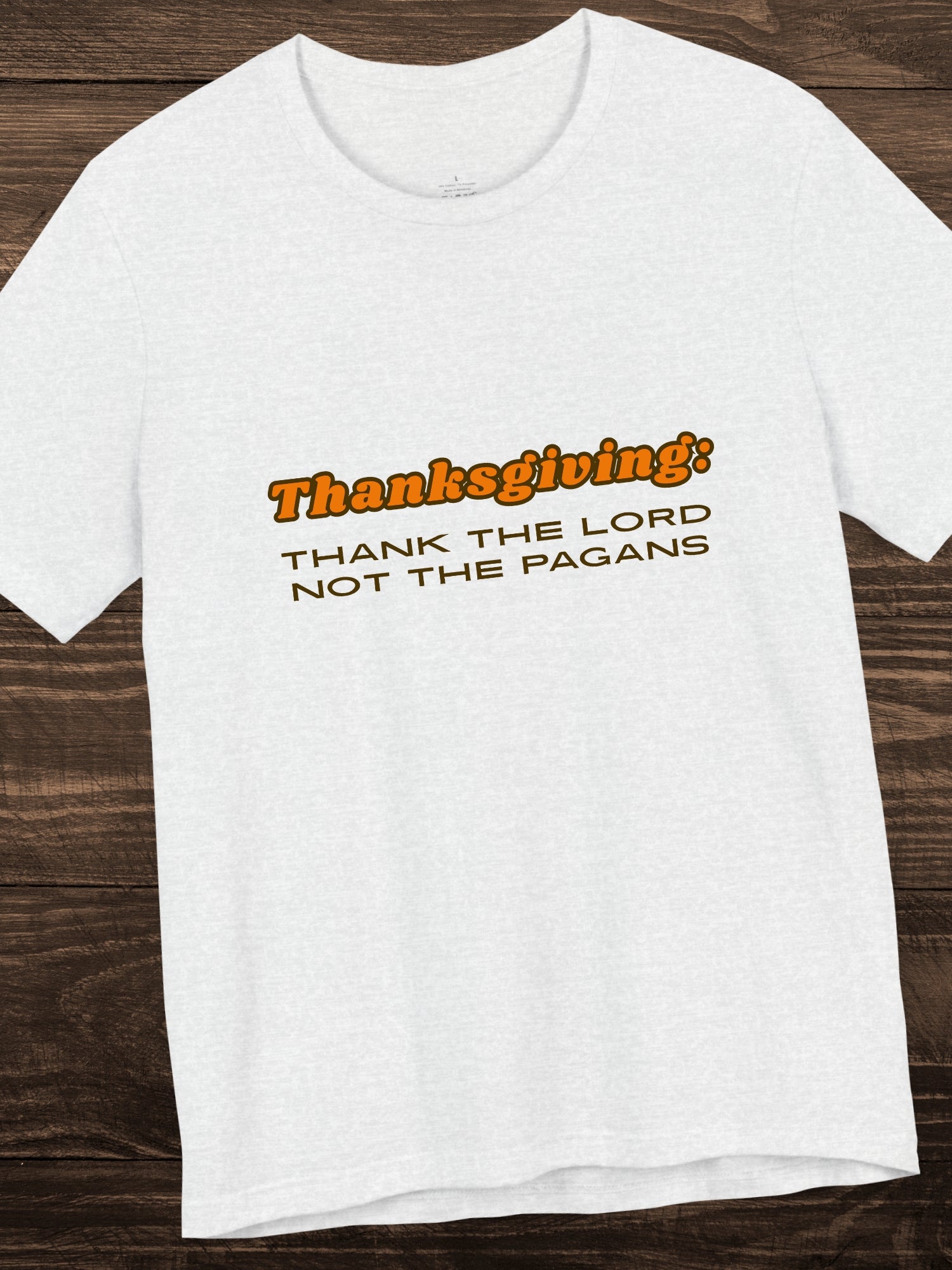 'Thanksgiving: Thank the Lord, Not the Pagans' Unisex T-Shirt. Printed on a quality Bella+Canvas 3001 T-Shirt.