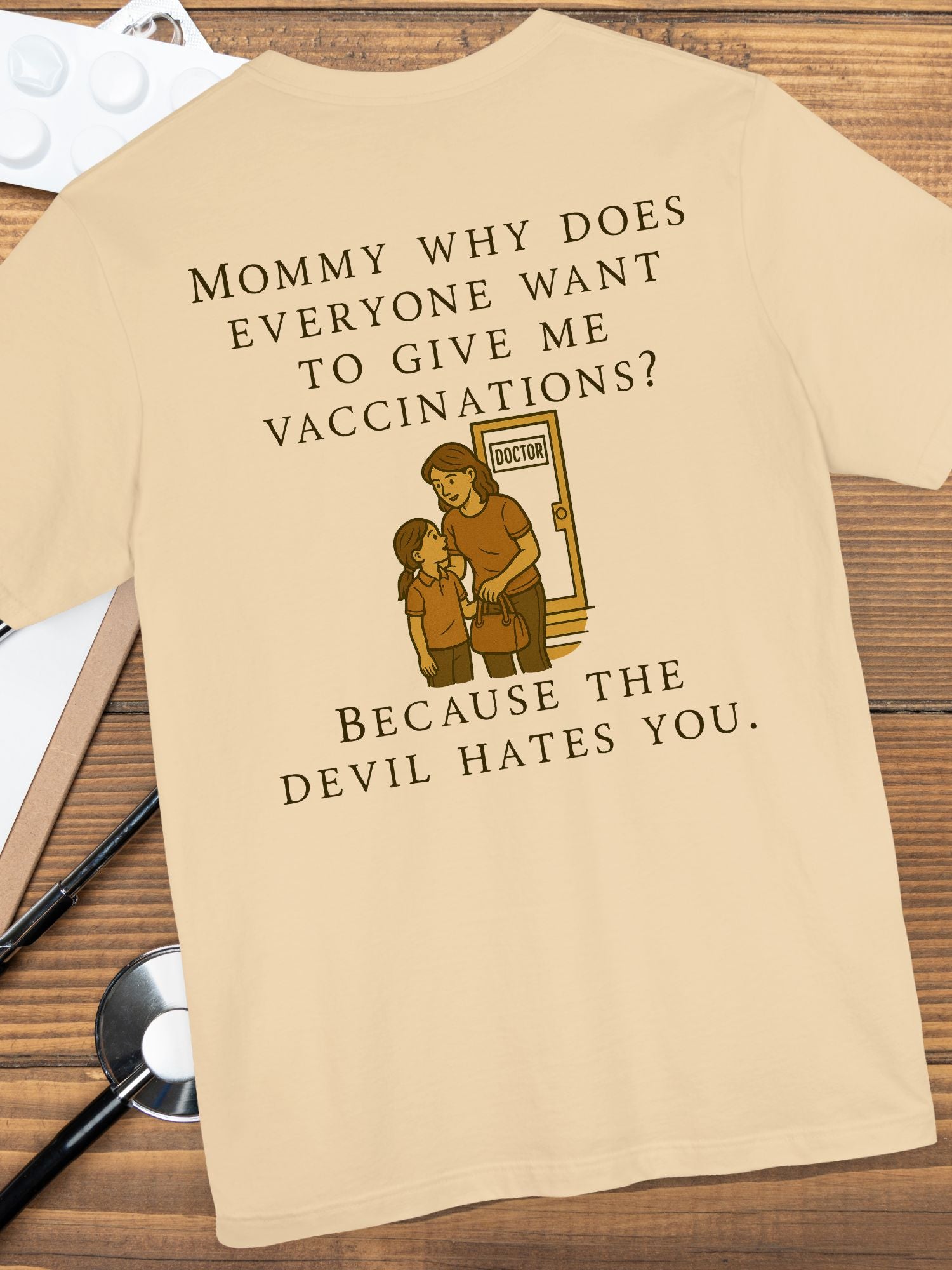 'Mommy why does everyone what me to take vaccines? Because the devil hates you.' Unisex Christian T-Shirt. Printed on a quality Bella+Canvas 3001 T-Shirt.