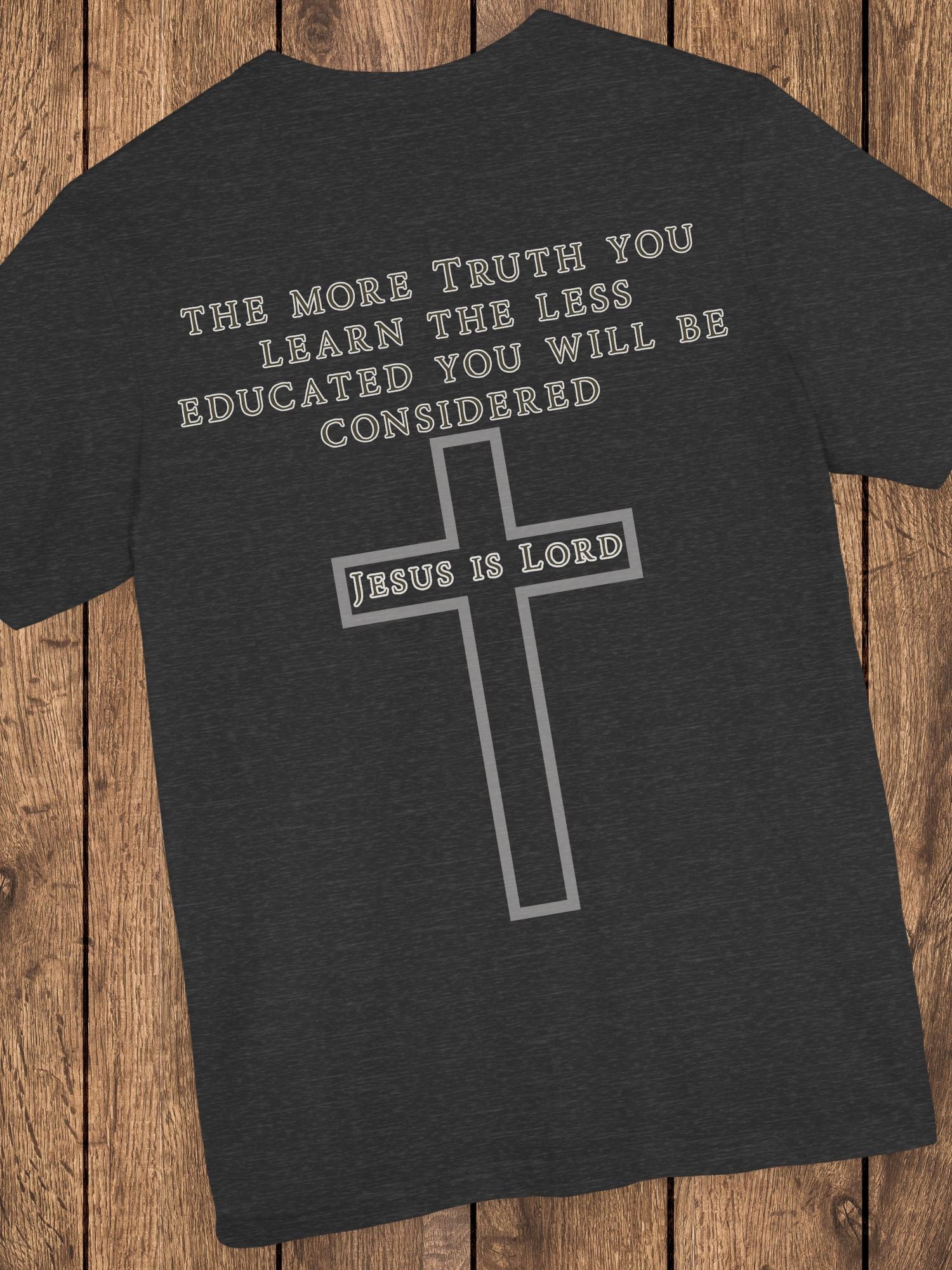 'The More Truth You Learn the Less Educated You Will be Considered, Jesus is Lord' - Unisex T-Shirt. Printed on a quality Bella+Canvas 3001 T-shirt.