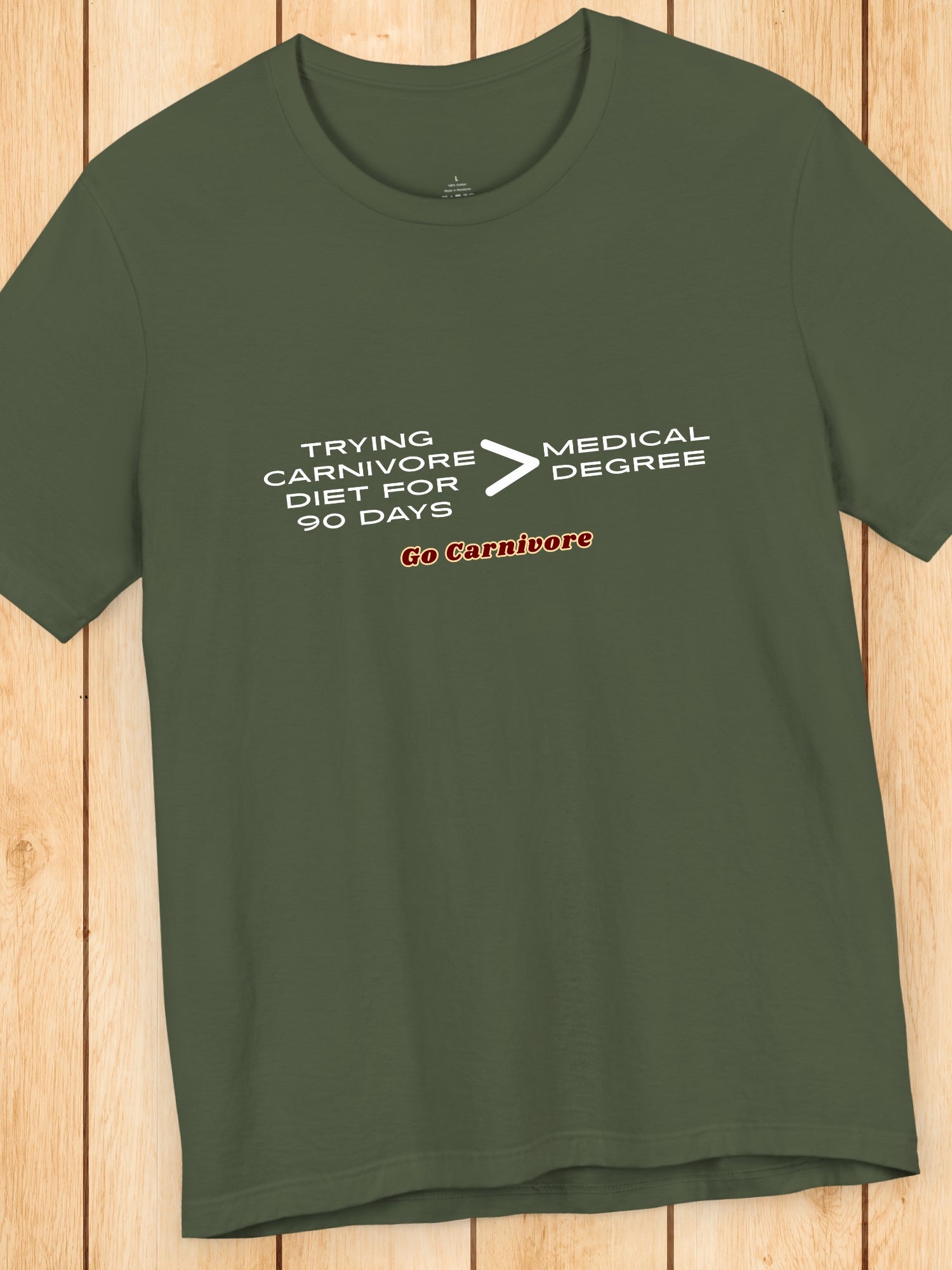 'Trying Carnivore Diet for 90 Days > Medical Degree, Go Carnivore' Unisex T-Shirt. Printed on a quality Bella+Canvas 3001 T-Shirt.