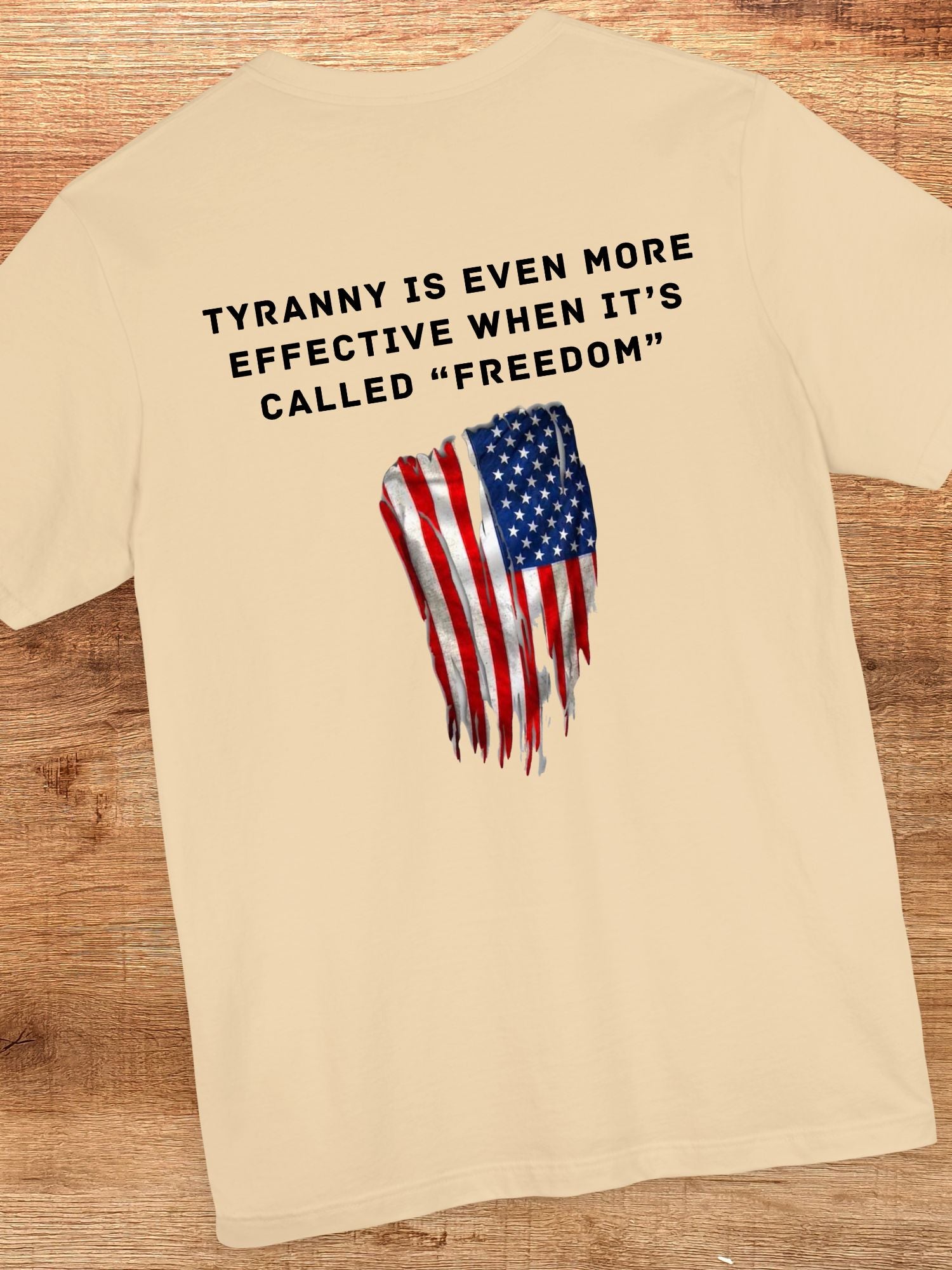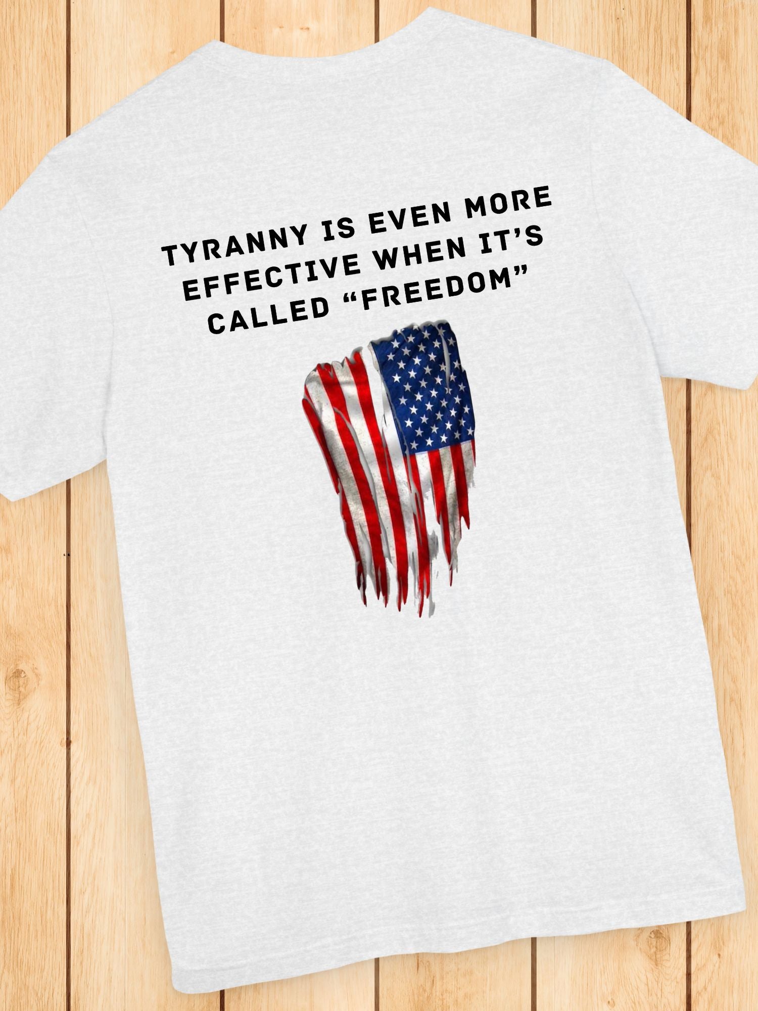 'Tyranny is Even More Effective When it's Called "Freedom"' Flag Graphic Unisex T-Shirt. Printed on a quality Bella+Canvas 3001 T-Shirt.