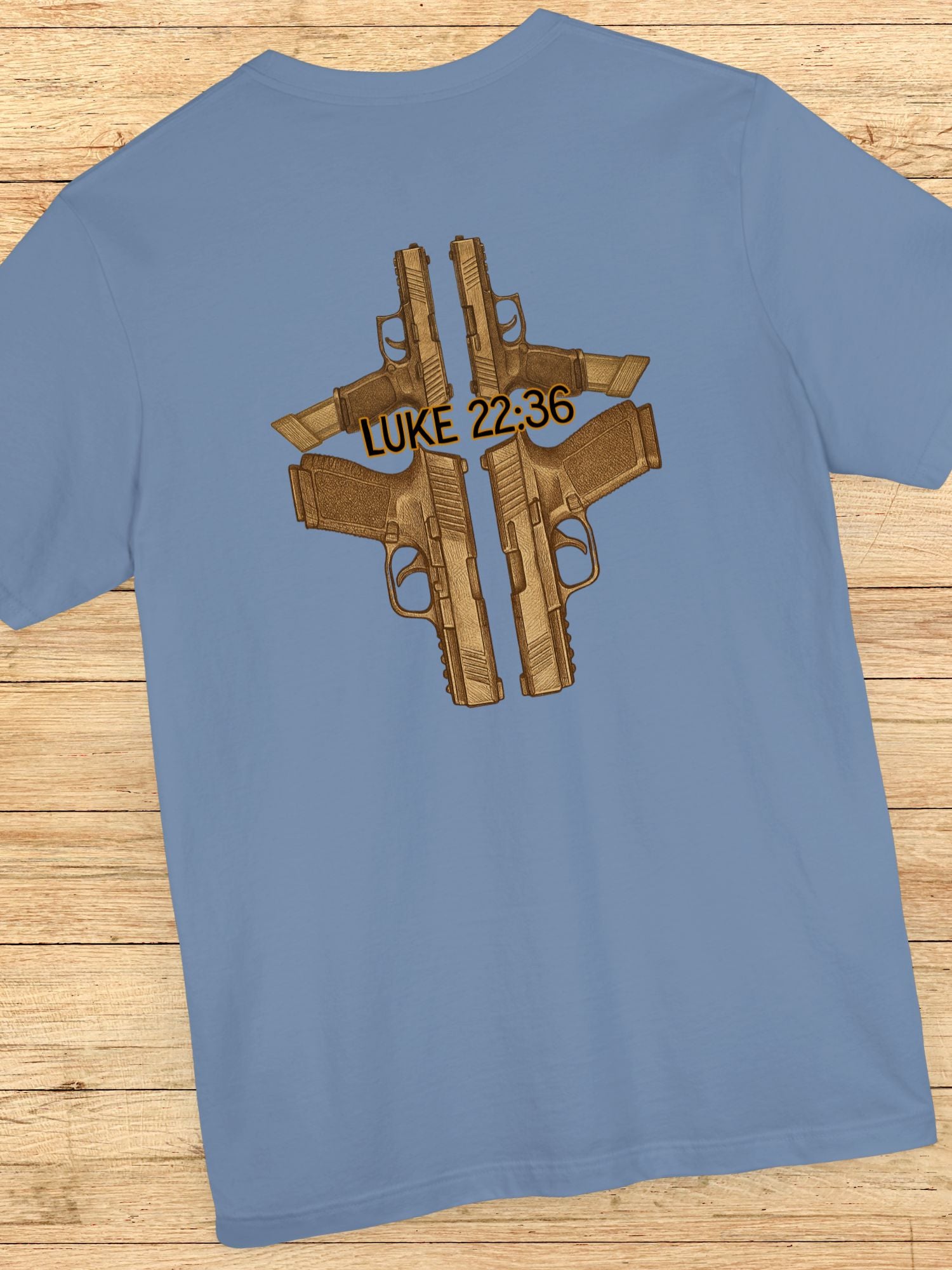 Handgun Cross with Luke 22:36 written Unisex T-Shirt. A shirt to remind others that Jesus wanted Christians to defend themselves from the world. Makes a great gift for other Christians. Printed on a quality Bella+Canvas 3001 T-shirt.