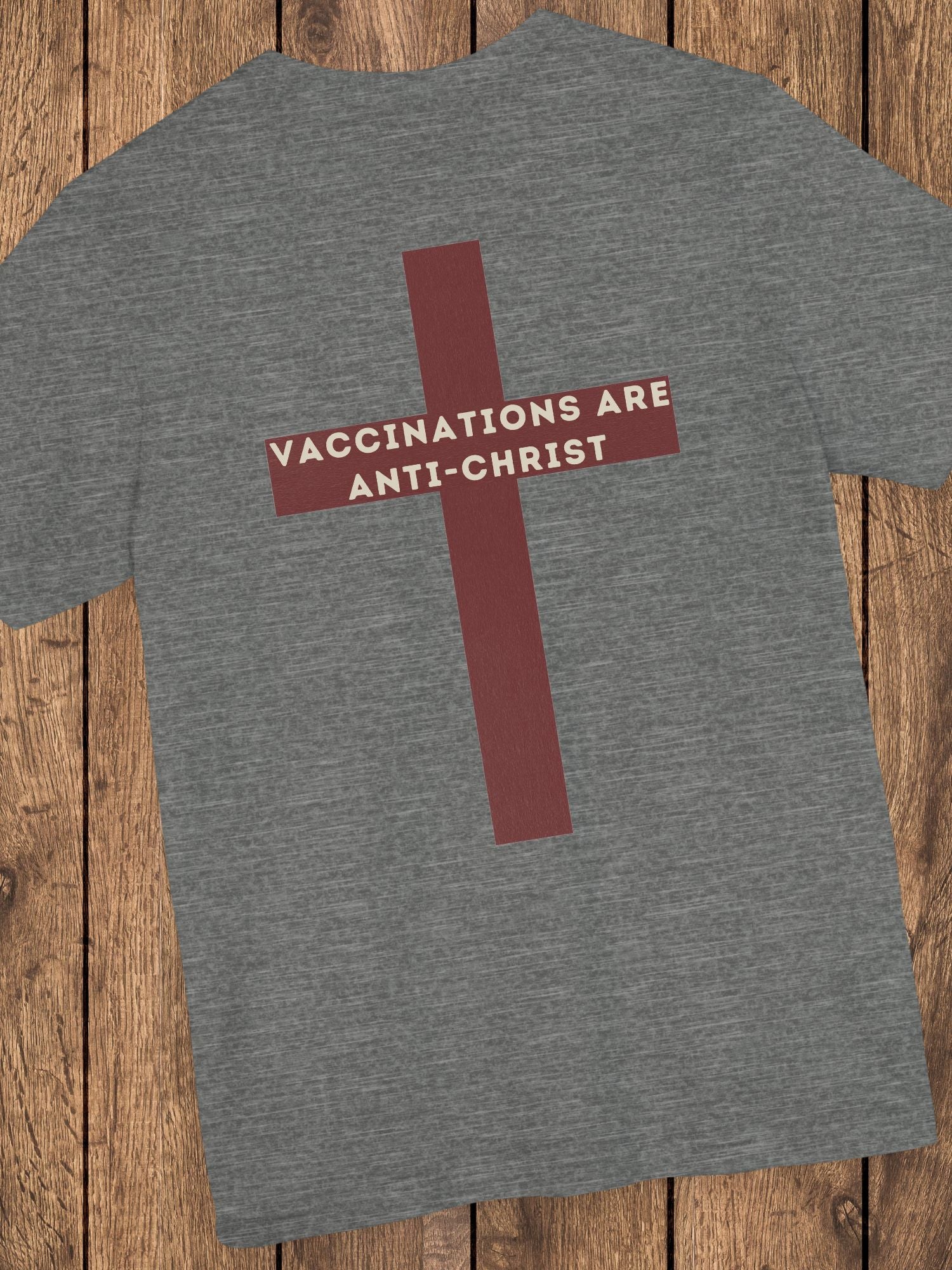 'Vaccinations Are Anti-Christ' Maroon Cross Unisex T-Shirt. Spread the truth, increase awareness. Printed on a quality Bella+Canvas 3001 T-Shirt.