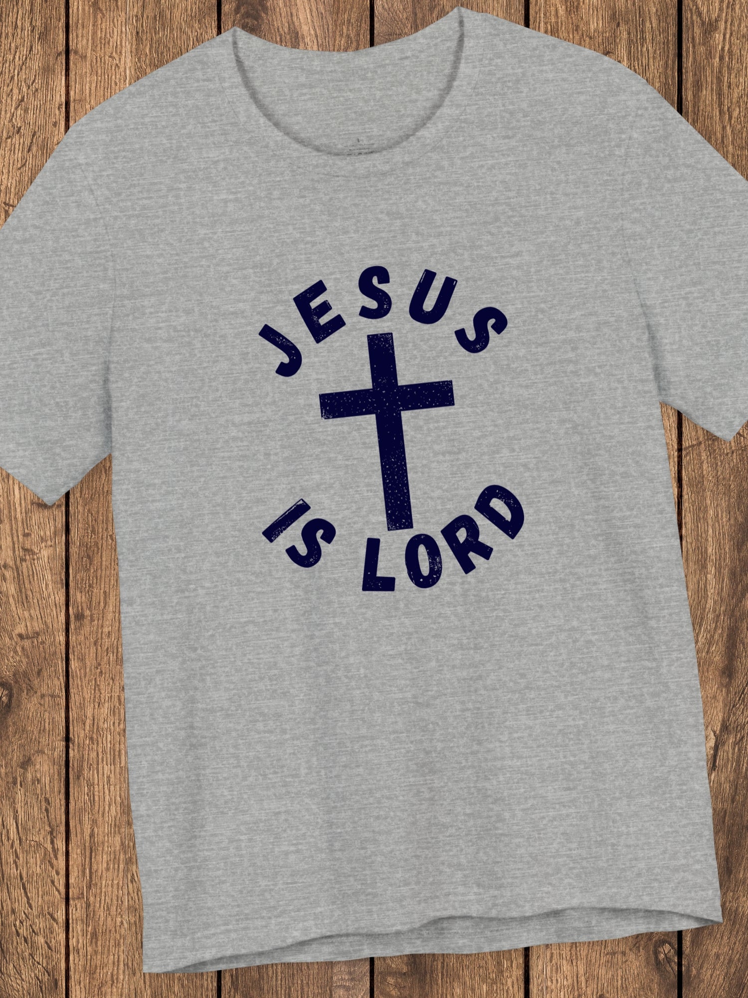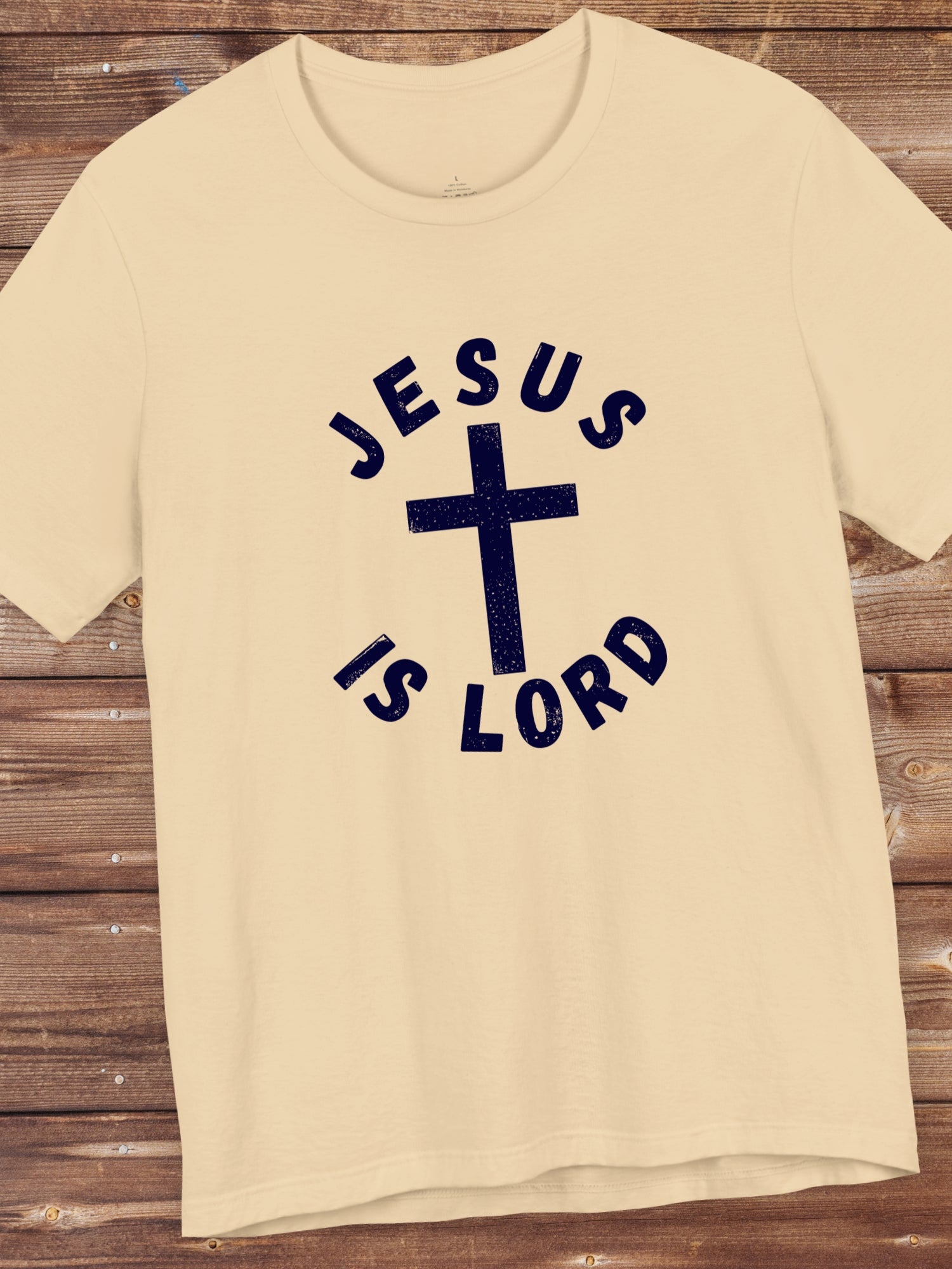 Ventage Style 'Jesus is Lord' Circular (Front) Design with Cross Graphic Unisex T-Shirt. Printed on a quality Bella+Canvas 3001 T-Shirt.