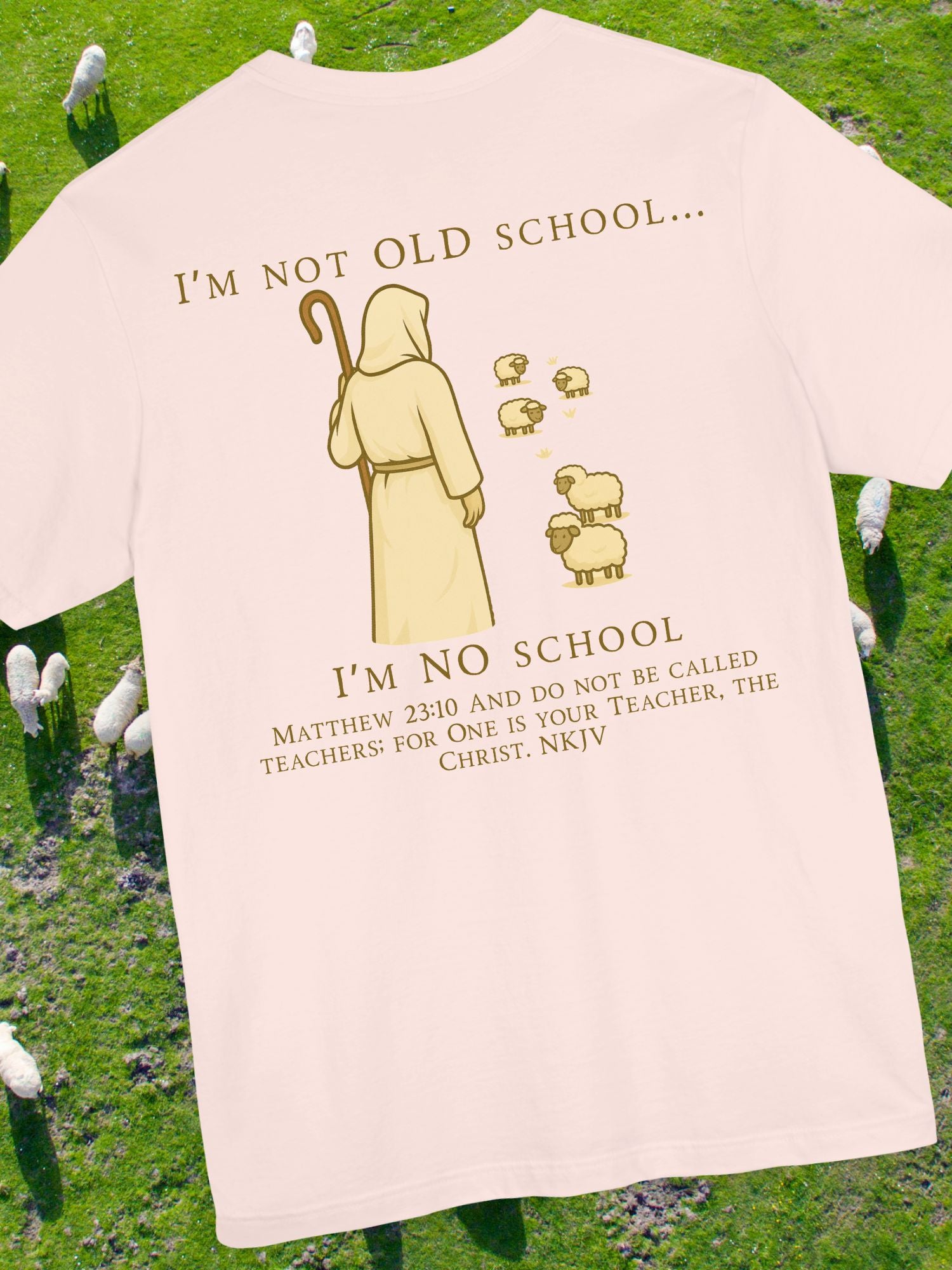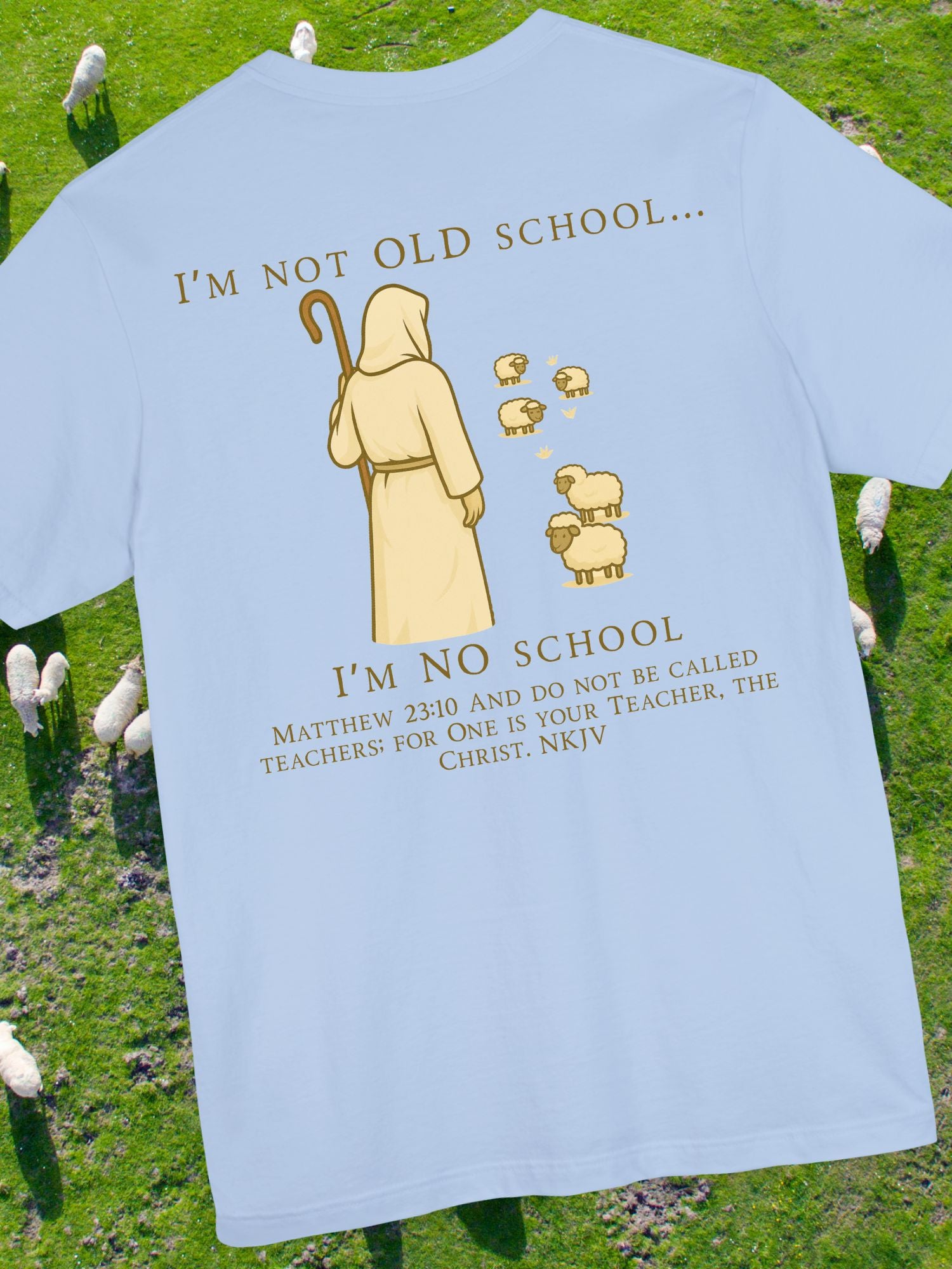 "I'm not OLD school, I'm NO school" with Matthew 23:10 verse. Printed on a quality Bella+Canvas 3001 T-shirt.