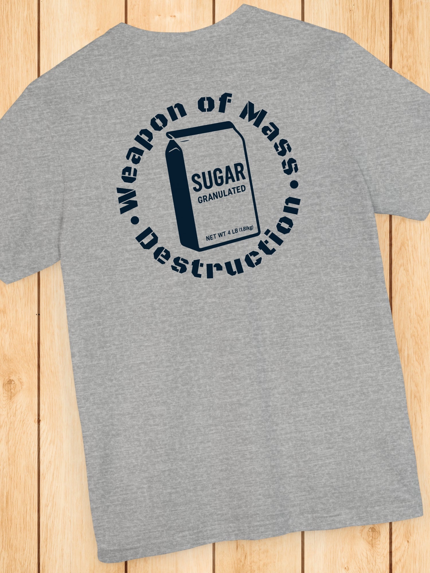 'Weapon of Mass Destruction' Bag of Sugar Graphic Unisex T-Shirt. Promote the truth on this biologically corrosive anti-nutrient. Printed on a quality Bella+Canvas 3001 T-Shirt.