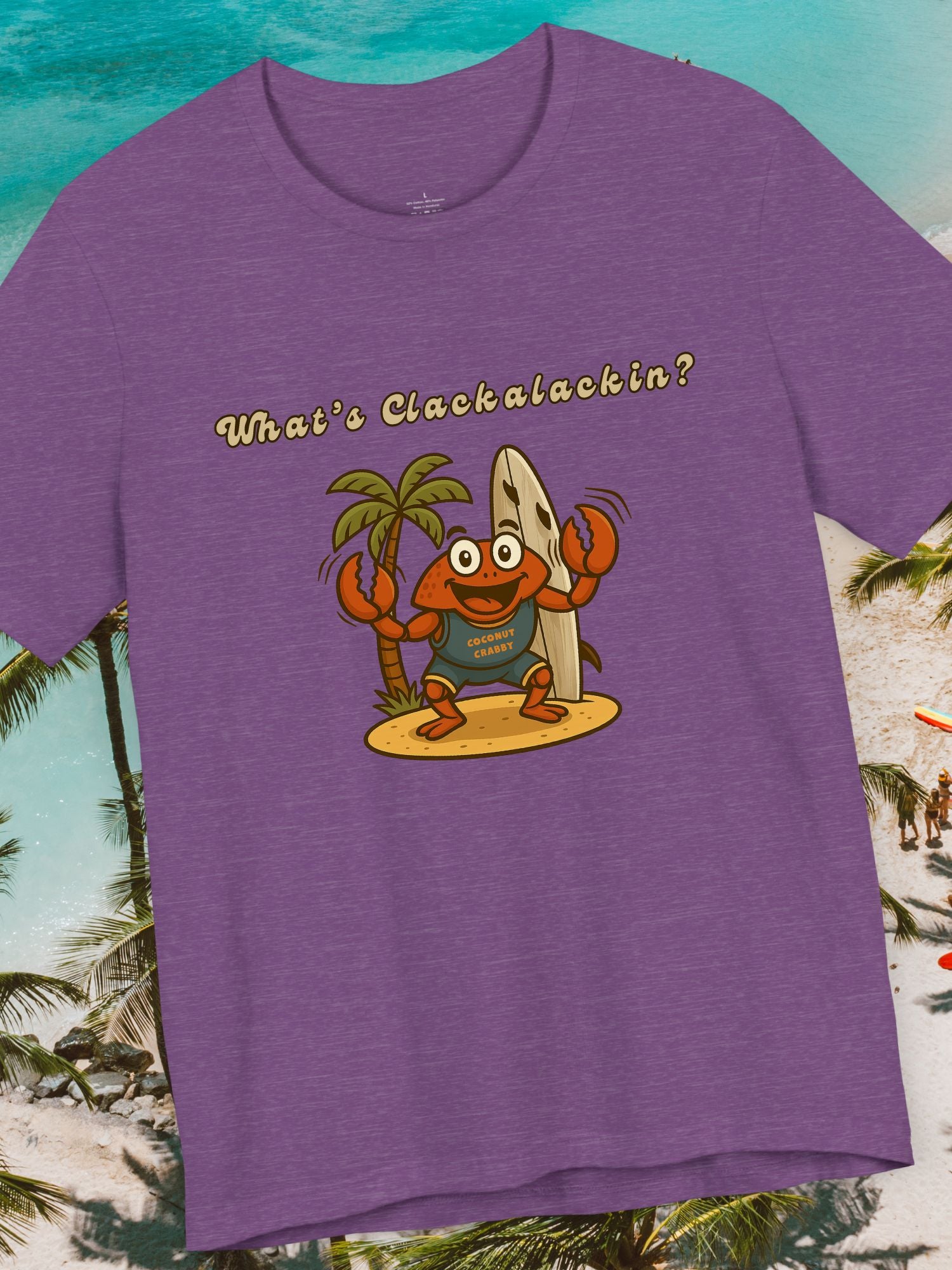 'What's Clackalackin?' Surfer Crab Unisex T-Shirt. A play on the phrase 'What's Crackalackin?'. This tee offers a playful vibe, making it an ideal choice for casual outings, beach adventures, or just lounging at home. Its unique design features Coconut Crabby. It's an excellent gift for birthdays, beach parties, or summer celebrations. Printed on a quality Bella+Canvas 3001 T-Shirt.
