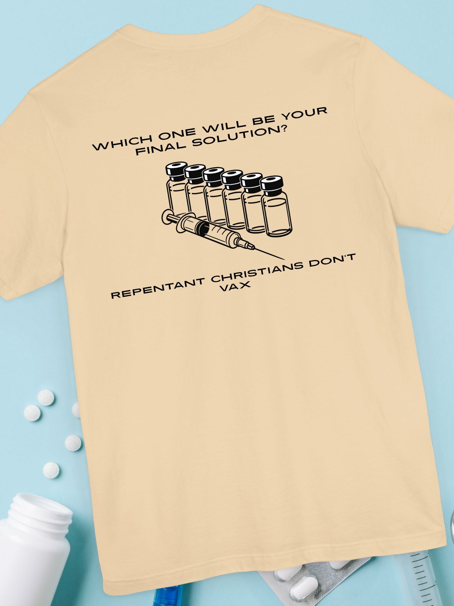 'Which One Will Be Your Final Solution? Repentant Christians Don’t Vax.' Unisex T-Shirt, Christian Apparel, Anti-Vaccination Tee