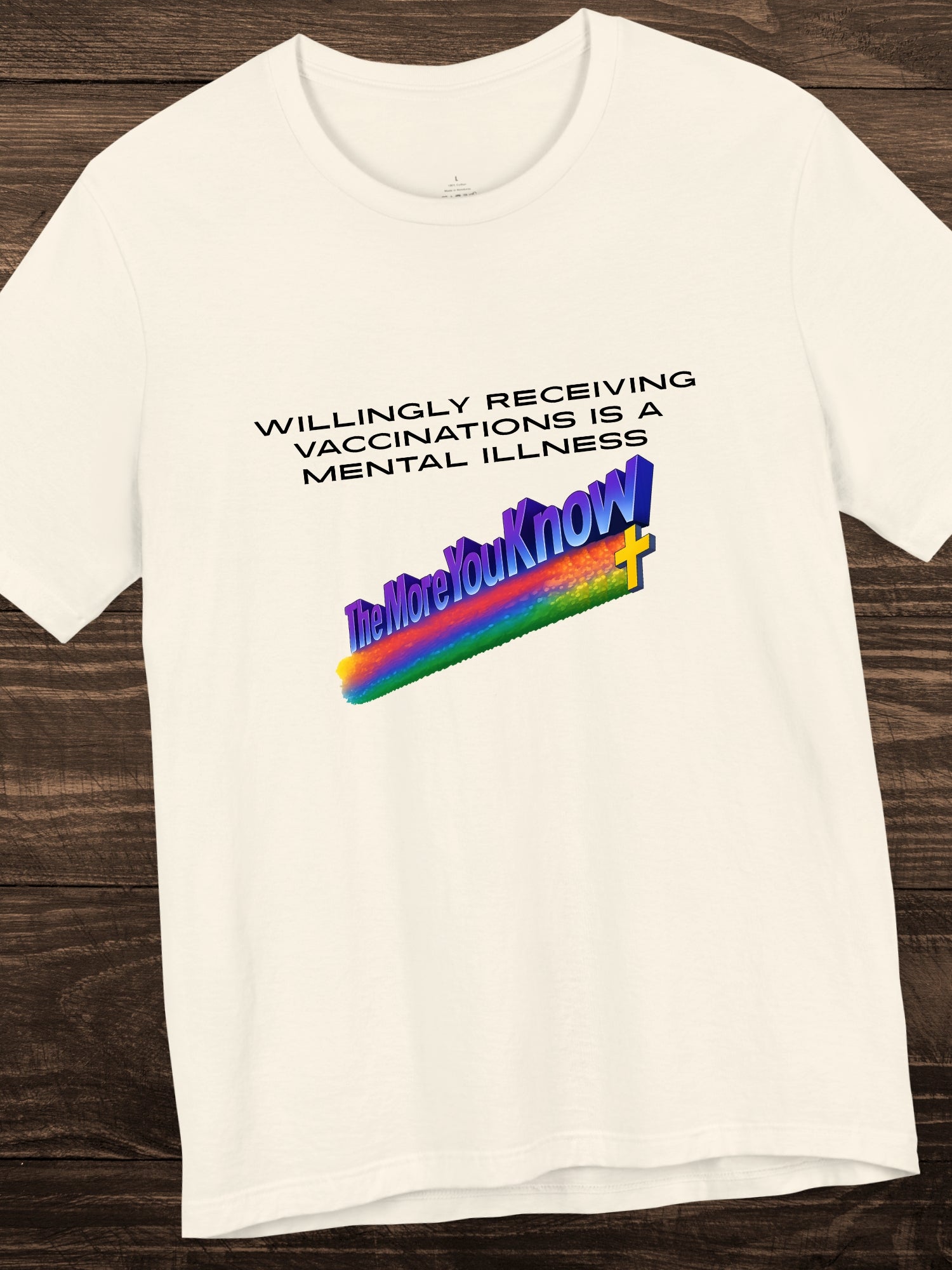 'Willingly receiving vaccinations is a mental illness, The More You Know' Unisex T-Shirt. Printed on a quality Bella+Canvas 3001 T-Shirt.