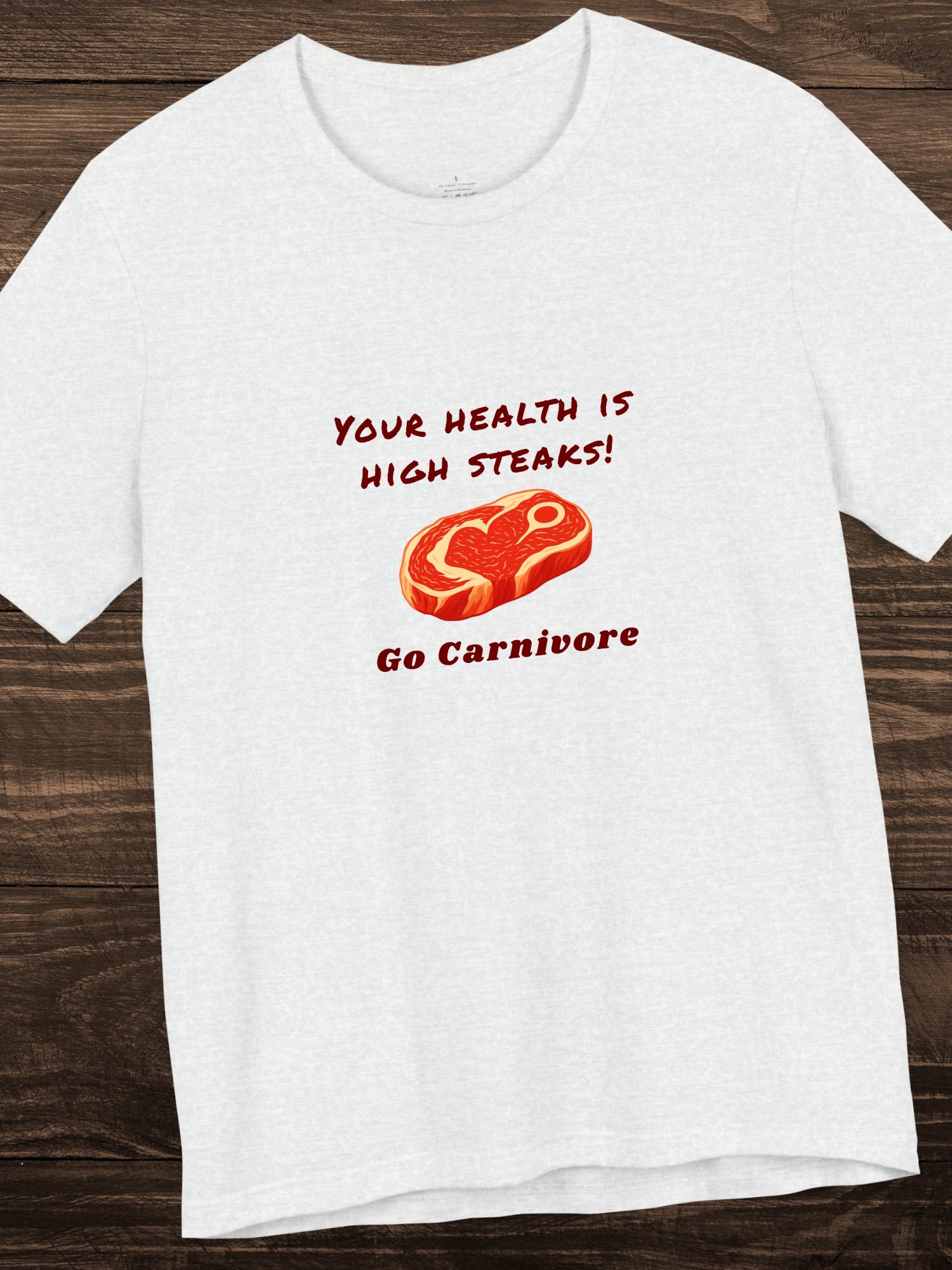 'Your Health is High Steaks! Go Carnivore' Steak Graphic Unisex T-Shirt. Printed on a quality Bella+Canvas 3001 T-Shirt.